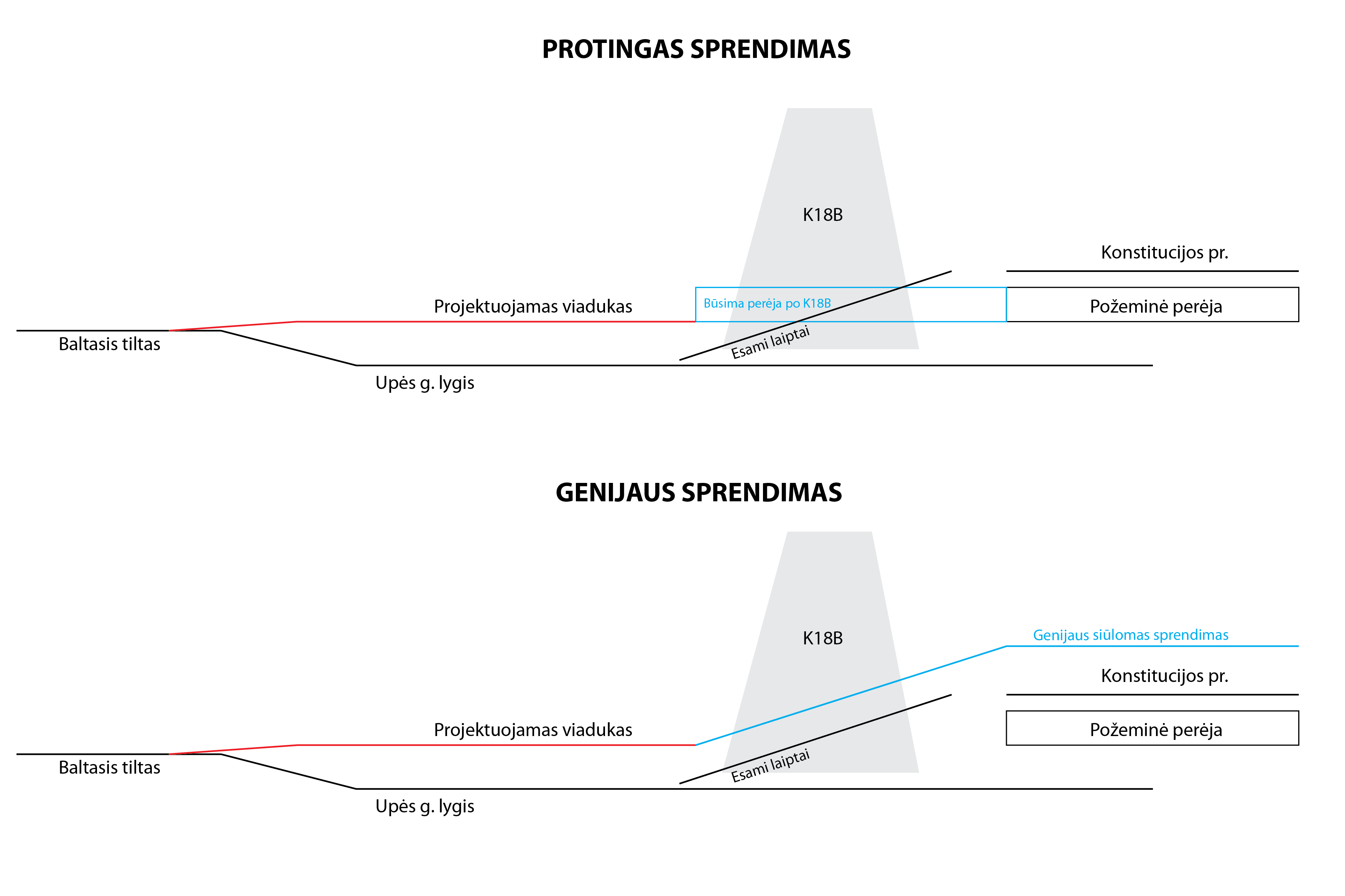 Oho, metų sprendimas, kokio negalima pritaikyti požeminėms perėjoms. Tiesiog wow. Neminint fakto, kad aukščių skirtumas Upės g. ir Konstitucijos pr. yra 10 metrų, tai tamsta dar siūlo visiems lipti 2-3 papildomus metrus aukštyn.