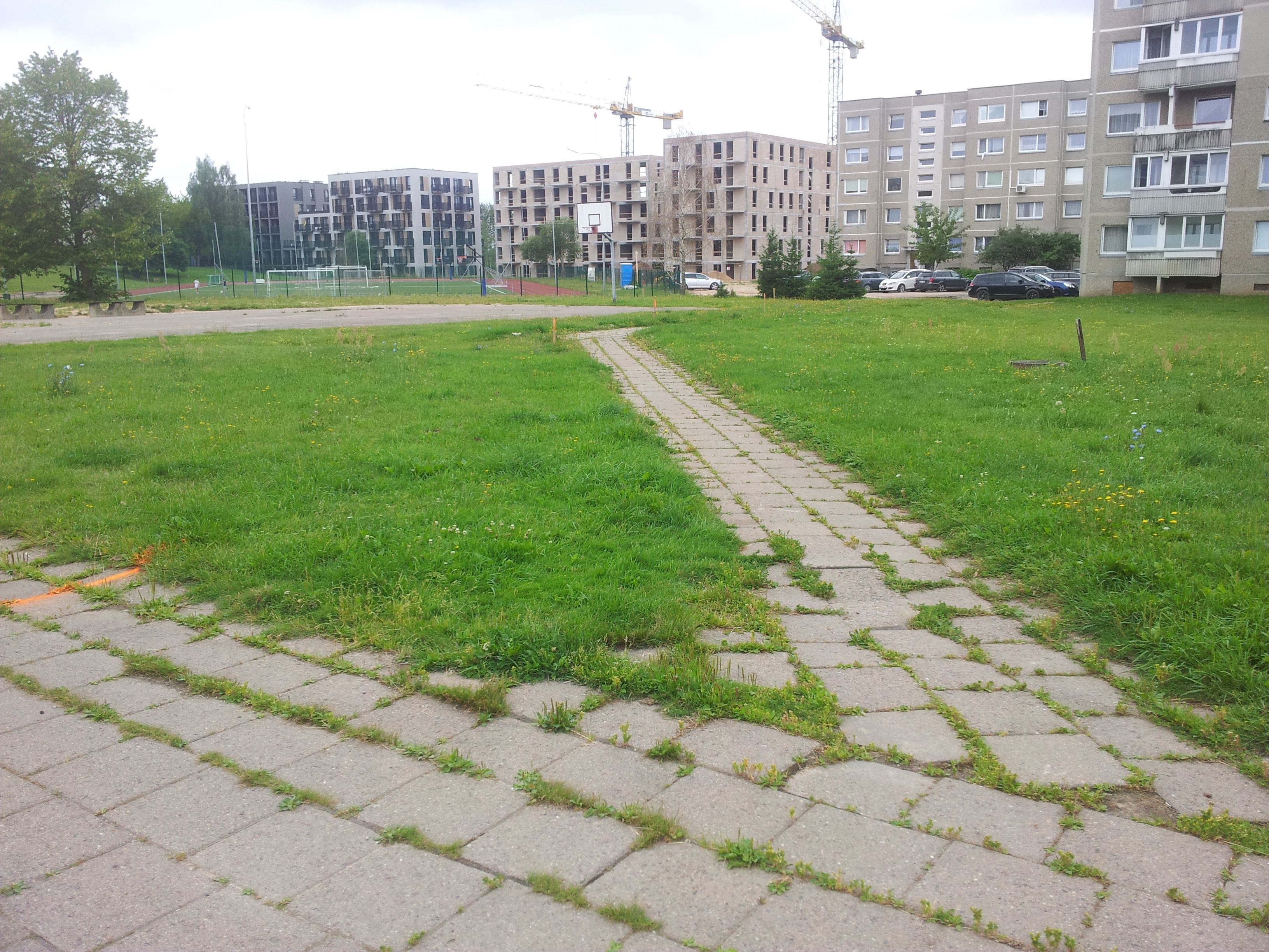 VMS PP metu mąstė ko prašyti vystytojų iš trijų variantų: 1) šaligatvio; 2) legalizuoti nelegalią parkofkę koriais; 3) atnaujinti krepšinio aikštelę. PP rašiau, kad reikia šaligatvio ir su unikaliomis medžiagomis ir jį apsaugoti nuo parkingo, tai panašu tokį variantą ir pasirinko. Sukalti kuoliukai naujam šaligatviui. Vienas kuolas negailestingai neteisėtai suvažinėtas: