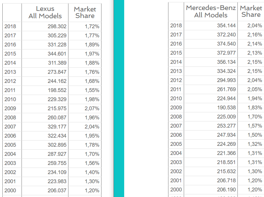 Tavo kalbom tikėt, tai pats matai žemiau, čia skaitosi "lexus nėra populiarus" vs "mb dominuoja"