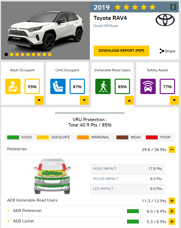 Konkrečiai šiuo atveju lyginamas RAV4 turi vieną aukščiausių VRU (vulnerable road user) reitingų tarp visų automobilių, tuo tarpu 208 turi vieną mažiausių.