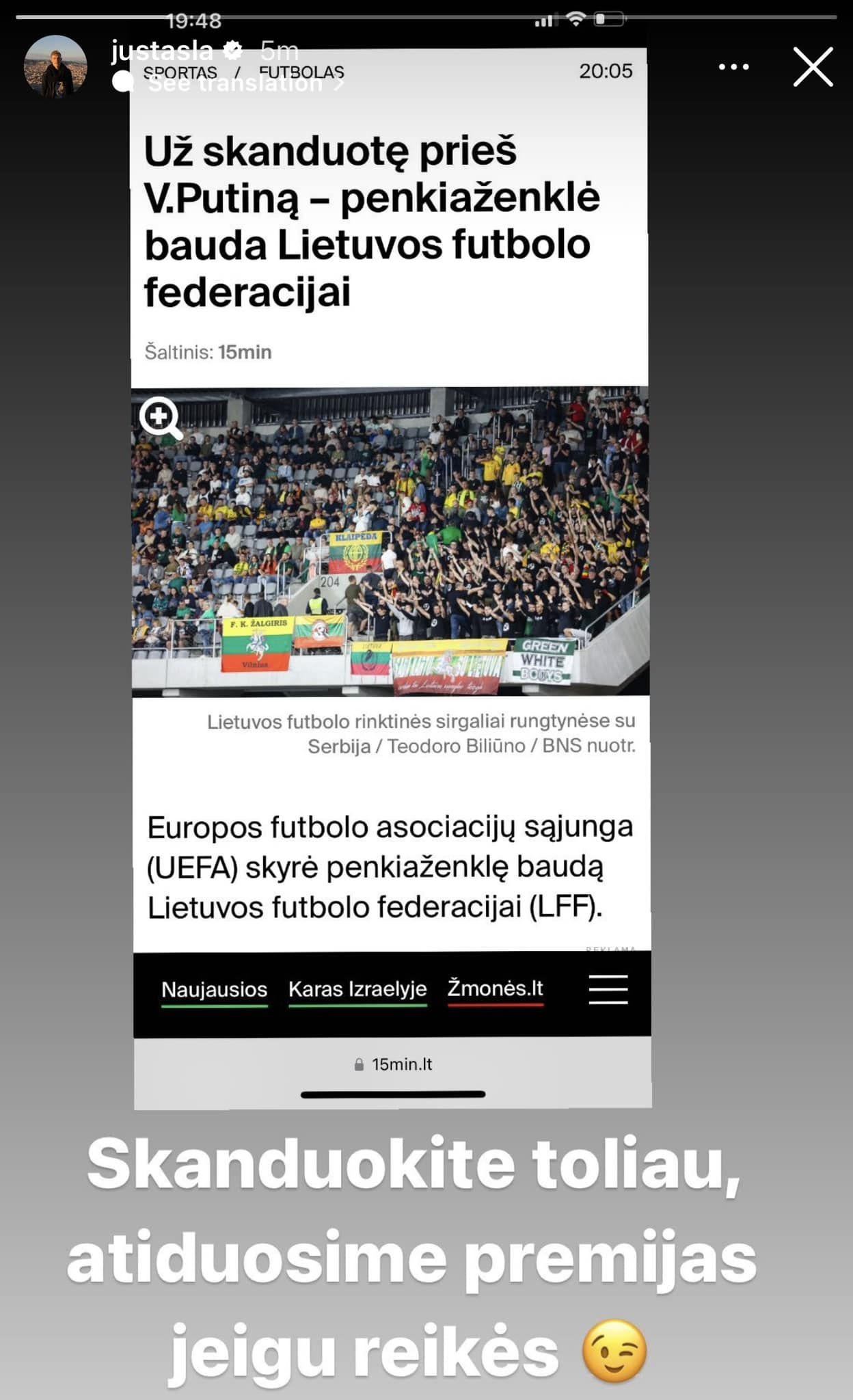 „Prieš skrydį į Bulgariją gavome UEFA pranešimą apie skiriamą 10 tūkst. eurų baudą už rungtynėse su serbais skambėjusias neetiškas skanduotes, konkrečiai už „Putin ch...o“, – teigė E. Stankevičius.