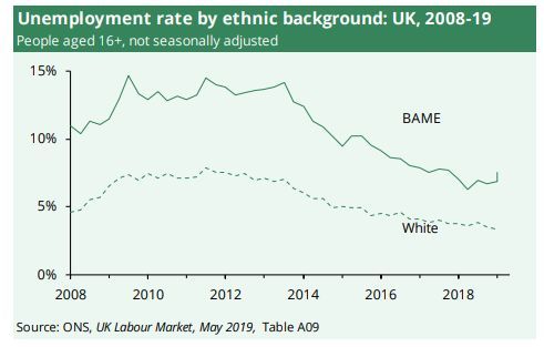Dar galima daryti spėjimą kad iš tų 8% BAME bedarbių yra ženkli dalis dirbančiųjų šešėlyje (dėl kalbos barjero, legalizacijos problemų). Tai skirtumas dar sumažėtų.