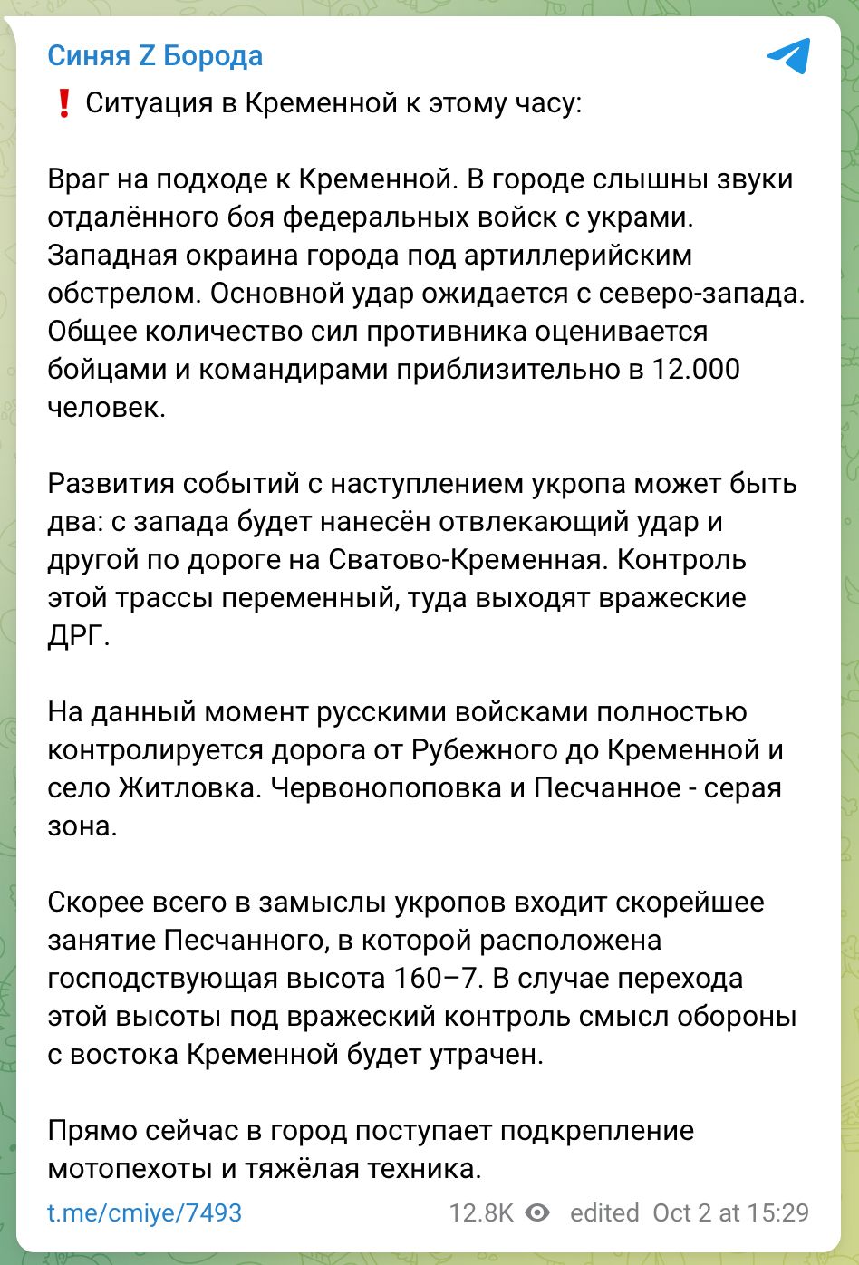 Šiandien Khersono srities geografijos pamokos:Parašė Eidvis Rodyti pranešimąŠiandien skaičiuosim Limano derlių - kiek paimta į nelaisvę, kiek sunaikinta ir kiek technikos jie paliko. Bet tiesą sakant aš labai milžiniškų skaičių nesitikiu. Iš Limano galima buvo pabėgti per mišką, kuriame juos medžioti buvo daug sudėtingiau nei kad kur kelyje ar laukuose, o technikos jeigu ir paliko, tai greičiausiai sunaikintos, kažkada pamokas turi išmokti ir vargu ar pasikartos Balaklėjos ir Iziumo scenarijus su šimtu perimtų tankų. Bet pagrindinė intriga - ar ukrainiečiai sustos ir įsitvirtins naujas frontas ar žygiuos toliau. Ir man atrodo, kad toliau tęsim Ukrainos geografijos pamokas ir mokysimės naujų miestų pavadinimus. Kadangi visiems labai įdomu buvo Limanas, tai net nelabai domėjomės, kad frontas pralaužtas buvo ir kitoje vietoje, prie Kupiansko ir panašu, kad šitie abu prasiveržimai turėtų susieiti į vieną tašką - Svatove miestą, pakeliui paimant ir kitus miestelius, kaip Kremina, kurie jau randasi Luhansko srityje. Kadangi ukrainiečiai veikia blickrygo principu, tai ar bus veržiamasi toliau tikriausiai jau net šiandien ir sužinosim.