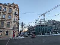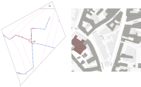Paskubomis iš Vilniaus žemėlapių eksportuotas DWG su esamais (mėlyna) ir naikinamais (raudona) šilumotekio bei gatvių linijomis (rožinė) sluoksniais ir šalia atvaizdas iš žemėlapio vietos...